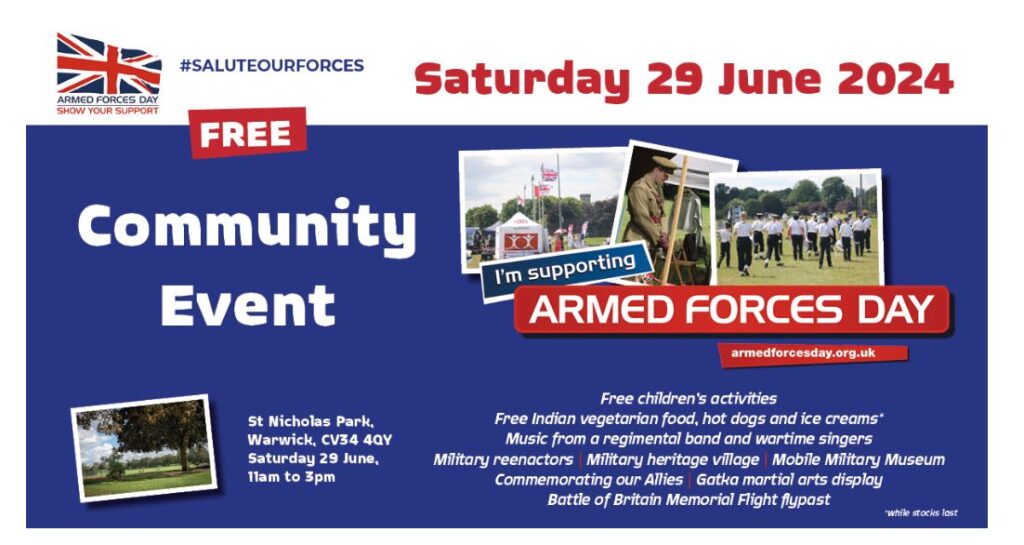 Warwick District Council is organising this special event as a thank you to those men and women who now protect our country, and those who did so in the past. There will be many activities taking place, along with free food and free activities for children, even a flypast from the Battle of Britain Memorial Flight’s Avro Lancaster (weather permitting). This event is not just for service families, it is an event for the whole community to say a special thanks to our Armed Forces and veterans. It takes place in St Nicholas Park from 11am – 3pm on Saturday 29th June. For further information visit www.warwickdc.gov.uk/armedforcesday