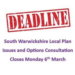 The South Warwickshire Local Plan consultation closes on Monday 6th March. If you have not yet responded and do not have time to complete the online consultation, you can email your views to: